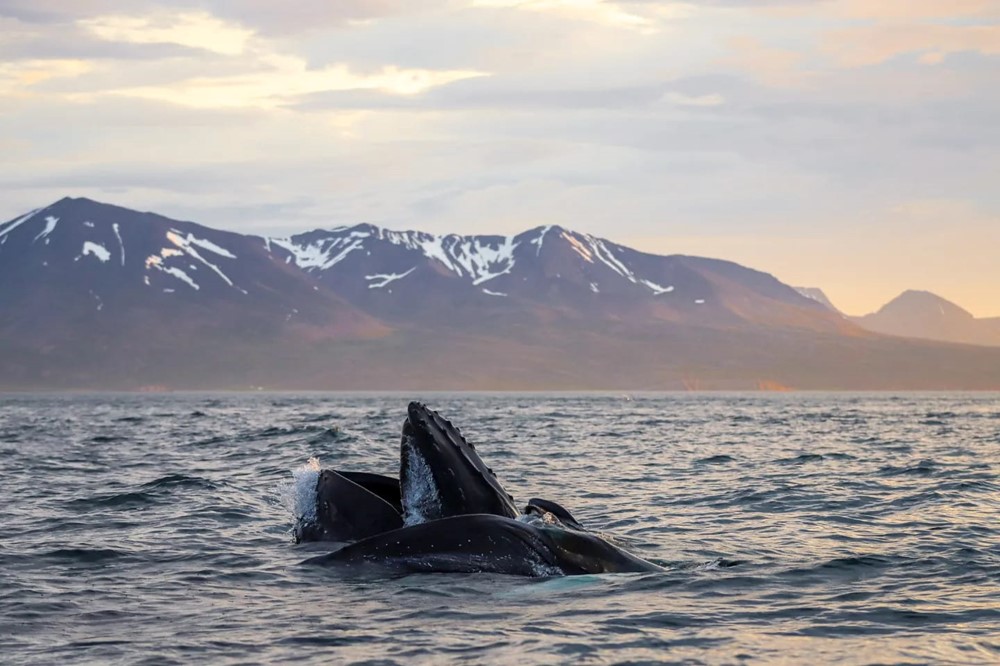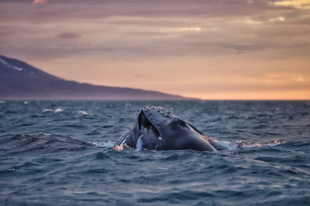 Oftentimes in the evenings, we see humpback whales feed close or even right below the surface. They come up with their mouth widely open, trying to catch as much prey at once as possible. A flock of birds might follow them, trying to catch the prey that has escaped the whales' mouth. The whales will be surfacing over and over, barely leaving for longer dives, filling up their mouth with food every minute.