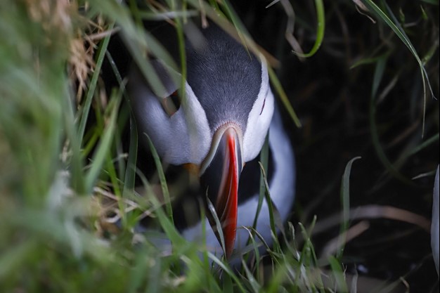 2. Puffins build burrows by using their beaks and feet to dig a hole in the ground. At the end of this tunnel is a room for their chick - the so-called puffling. At the entrance of the burrow, the parents establish a toilet area, which is cleaned out frequently. This ensures that the burrow and, most importantly, the chick's feathers stay clean while it doesn't have to leave its home at all for the first weeks of its life - not even when needing the loo.