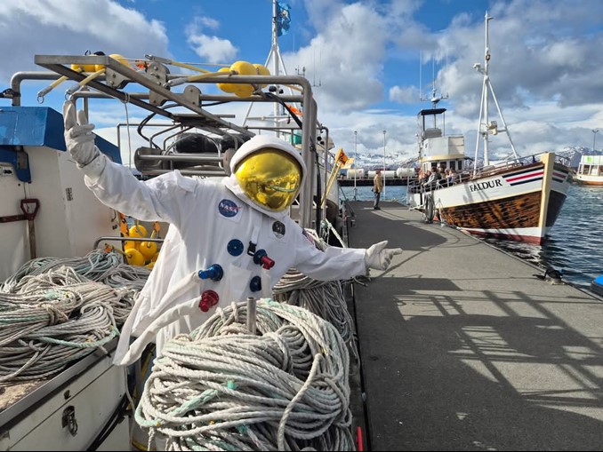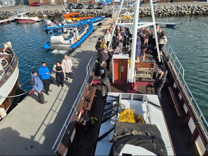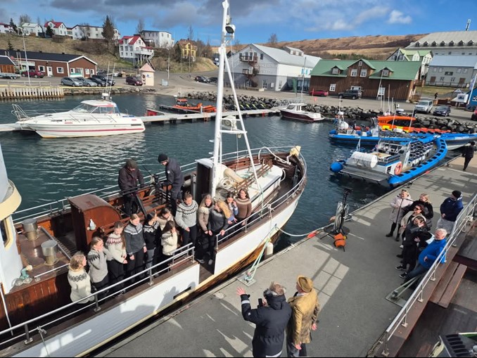Sunshine greeted the band upon arrival in Húsavík and together with the local girls choir, they boarded our dear oak boat Sylvía to achieve their dream.