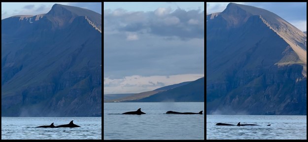 If I am alone? Oh no, the rest of my group is hanging out by the mountains on the other side of Skjálfandi Bay. I had a little argument with one of the other males, it happened we became a bit combative and used our heads to hit one another. So here I am, doing my own thing for a little while before joining my group again eventually. My group currently consists of seven individuals, but numbers change from time to time. However, some of us have been around each other for a long while now. We’re a mixed group indeed, but it is not unusual to find groups segregated by sex, age or life stage.