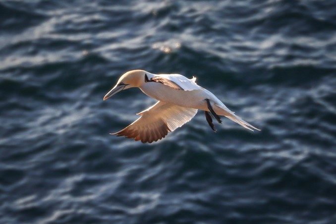 That said, their hunting skills alone are something only few seabirds can match: Spotting schools of fish from above, they fold their wings back and dive like arrows into the ocean from heights of up to 40 metres and at speeds of 60 mph / 97 kmh. To withstand the impact, gannets have evolved special adaptations: air sacs in their face and chest act like cushions, and their nostrils are internal, preventing water from rushing in. Their preferred prey includes mackerel, herring, and sand eels, which they often catch underwater after their initial plunge.