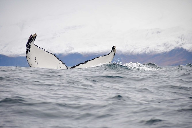 Some days, everything turns white as snow falls from the sky and melts the moment it touches the ocean. The icy-blue sea and snow-covered mountains frame the scene, and each surfacing whale stands out in striking contrast against the muted landscape.