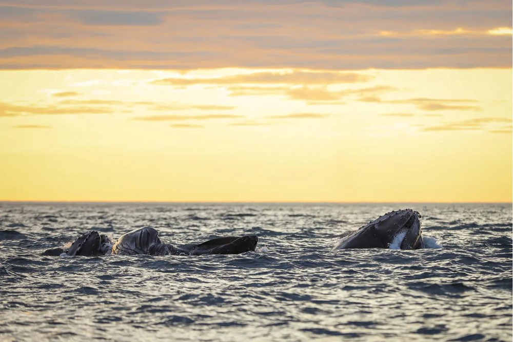 Oftentimes in the evenings, we see humpback whales feed close or even right below the surface. They come up with their mouth widely open, trying to catch as much prey at once as possible. A flock of birds might follow them, trying to catch the prey that has escaped the whales' mouth. The whales will be surfacing over and over, barely leaving for longer dives, filling up their mouth with food every minute.