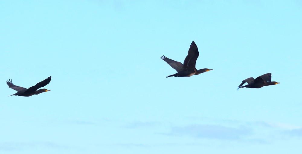 Cormorants are large black waterbirds with long tail and neck. They feed of small fish and after fishing they are commonly seen on the rocks with their wings open to dry them.
