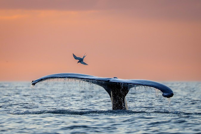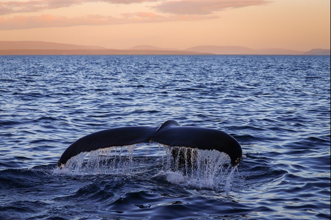 All there is that's you on a boat somewhere on the waters of Skjálfandi Bay, and while you admire a gentle humpback whale surfacing and diving around the vessel, the setting sun is illuminating the sea and mountains in the background.