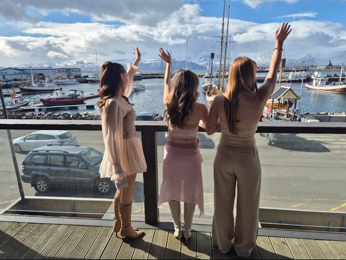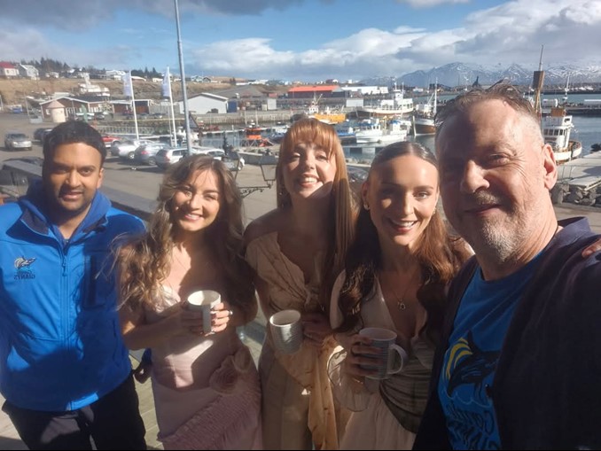 Sunshine greeted the band upon arrival in Húsavík and together with the local girls choir, they boarded our dear oak boat Sylvía to achieve their dream.
