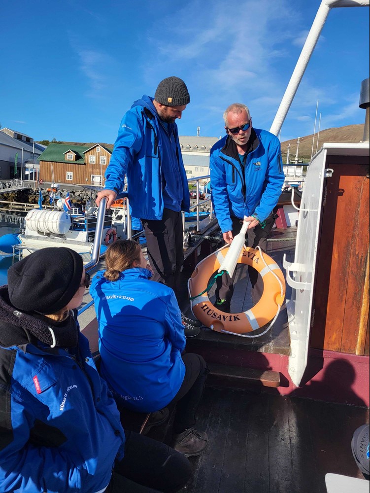 Hallgrímur Guðmundsson, our head captain of the oak boats, walked the crew through the safety features on board Sylvía and Faldur. He pointed out important emergency equipment like first aid kits, fire extinguishers, life rings, and life rafts, explaining how each one works and when to use them.