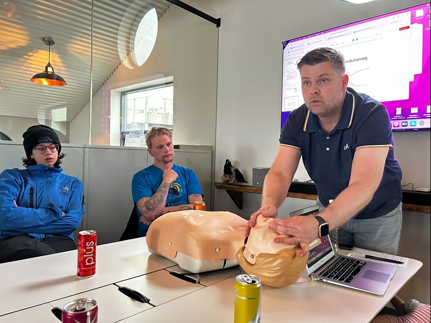 Eysteinn Heiðar Kristjánsson demonstrating how to perform CPR