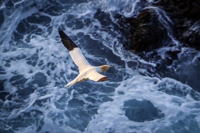 That said, their hunting skills alone are something only few seabirds can match: Spotting schools of fish from above, they fold their wings back and dive like arrows into the ocean from heights of up to 40 metres and at speeds of 60 mph / 97 kmh. To withstand the impact, gannets have evolved special adaptations: air sacs in their face and chest act like cushions, and their nostrils are internal, preventing water from rushing in. Their preferred prey includes mackerel, herring, and sand eels, which they often catch underwater after their initial plunge.